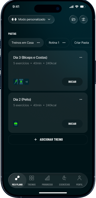 No Modo Flexível, o aplicativo segue sua sequência, independentemente do dia (ex.: Dia 1, Dia 2…).Você pode editar seu plano a qualquer momento nas configurações e escolher o modo que melhor se adapta à sua agenda.
