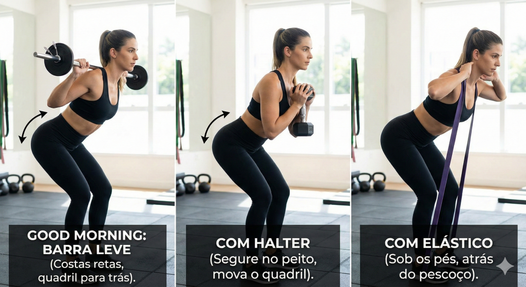 Por que entra no seu treino: reforça o padrão de “dobrar o quadril” e fortalece posterior e lombar de forma inteligente.